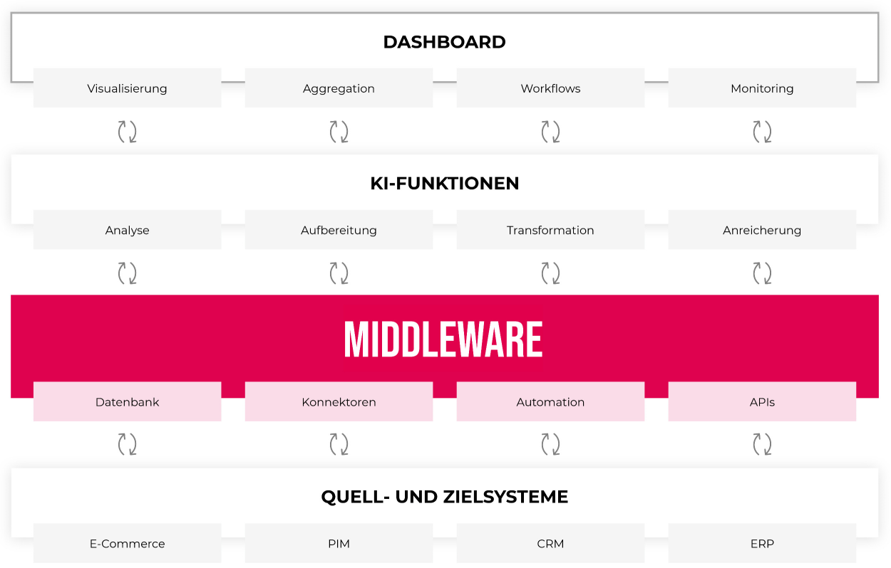 Mit unserer KI-unterstützten Middleware-Lösung verbinden wir nahtlos KI und Ihre individuellen Unternehmenssysteme. Neben den grundlegenden Funktionen einer Middleware für Datenintegration, Transformation, Aggregation und Datendistribution bildet unsere KI-Middleware die zentrale Anlaufstelle für die effektive und zielgerichtete Integration und Nutzung von KI.